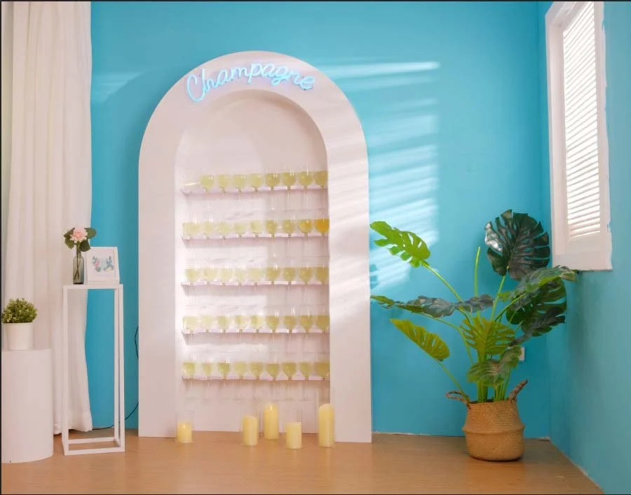 Imagine a pristine white wall adorned with cascading shelves of premium champagne bottles, each one waiting to be uncorked in celebration. The soft glow of ambient lighting accentuates the effervescent allure, creating an atmosphere that is both sophisticated and inviting. Perfect for weddings, galas, or any event that demands an extra touch of opulence, the White Grandeur Champagne Wall adds a touch of glamour to your celebration.
