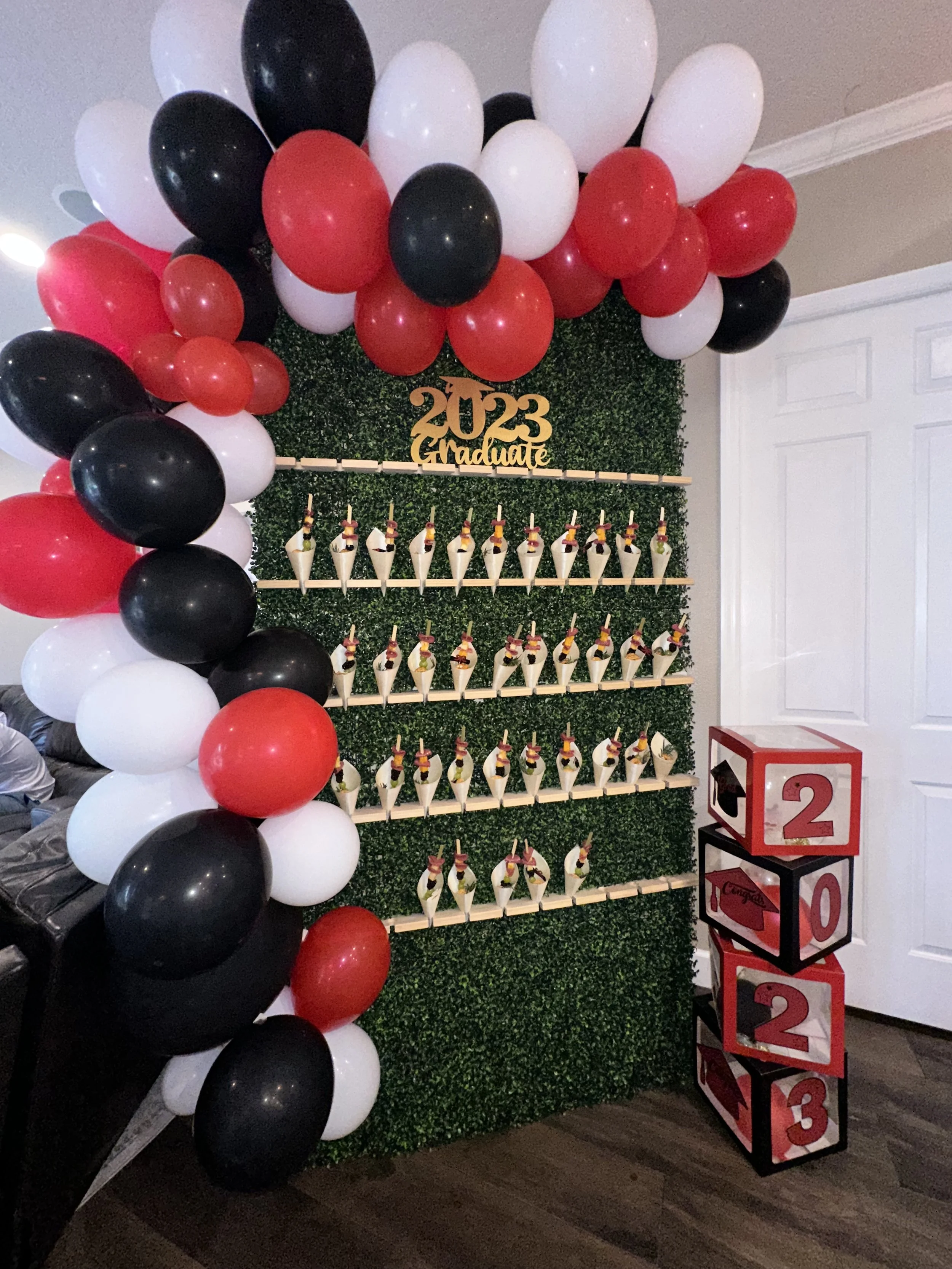 Imagine a wall adorned with sleek, black shelves showcasing carefully curated gifts, each wrapped in opulent packaging that exudes sophistication. This is not merely a decorative element; it's a focal point that invites guests to explore and discover the allure of thoughtfully chosen presents. Whether you're hosting a corporate event or a lavish celebration, the Black Grandeur Gift Wall adds a touch of mystery and excitement, creating an interactive space where anticipation builds with every carefully wrapped box.